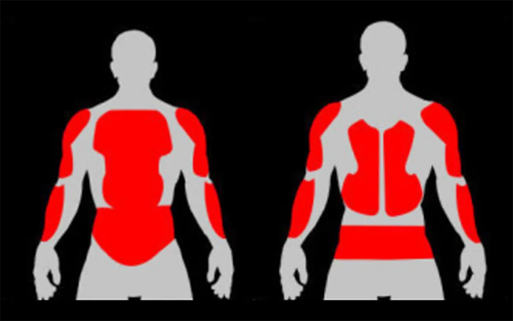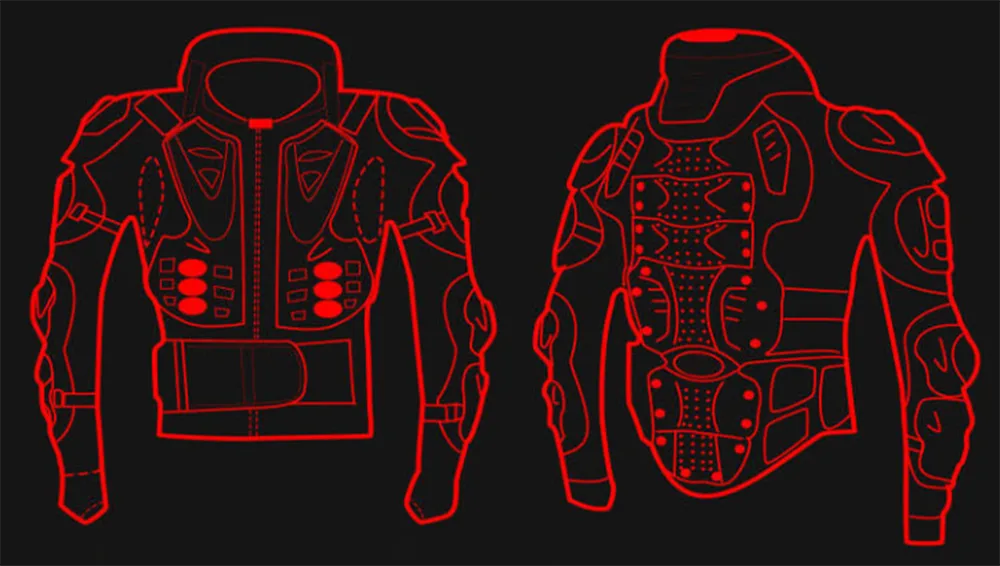 Indar handiko konposatuak: motozikleta kentzeko goiko gorputz-armadurak abiadura handiko inpaktuak jasateko diseinatuta.Honeycomb energia xurgapena: energia zinetikoa gainazalean barreiatzeko diseinatutako barne-egitura espezializatua, trauma lokalizatuak minimizatzeko. Estaldura osoko blindajea: sorbaldak, ukondoak, bularraldeak eta bizkarretarako babes estrategikoa.